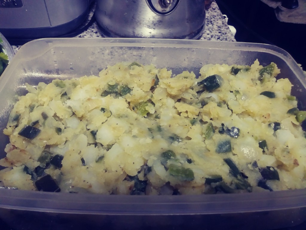 - 5 medium potatoes, chopped in fine cubes and cooked