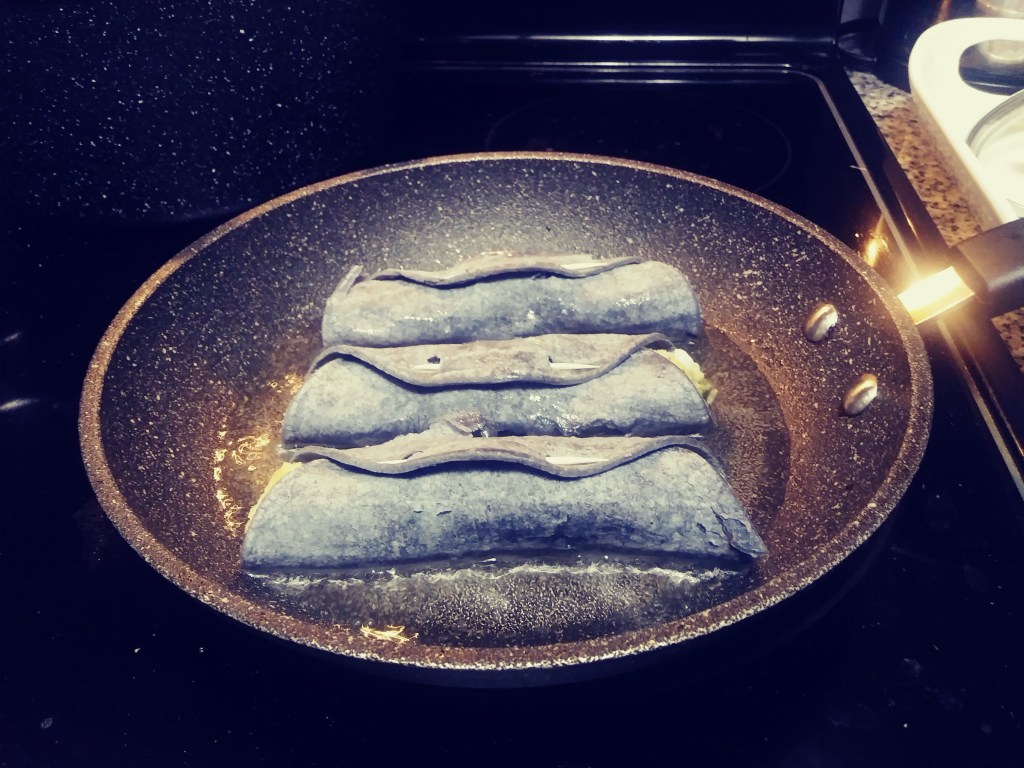 Fill the tortillas with the potatoes and peppers mixture. Use toothpicks to close and hold the filling.