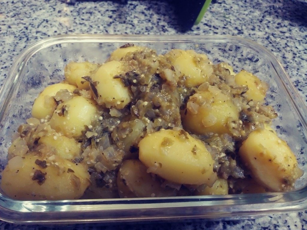 In a large pot or wok fry 1 small onion and 1 clove of garlic (both finely chopped) until they get caramelized. Add the potatoes and the green tomatoes salsa. Cover with lid and let simmer.