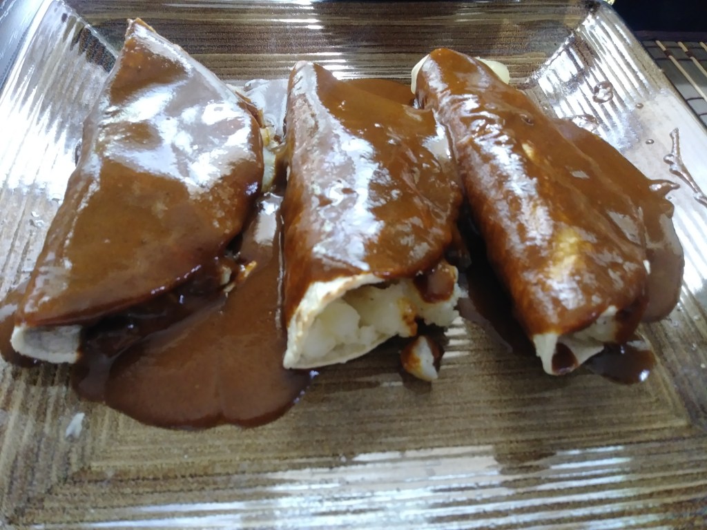 Warm tortillas in a comal, cover them with mole inside and outside. Add your preferred filling and toppings.