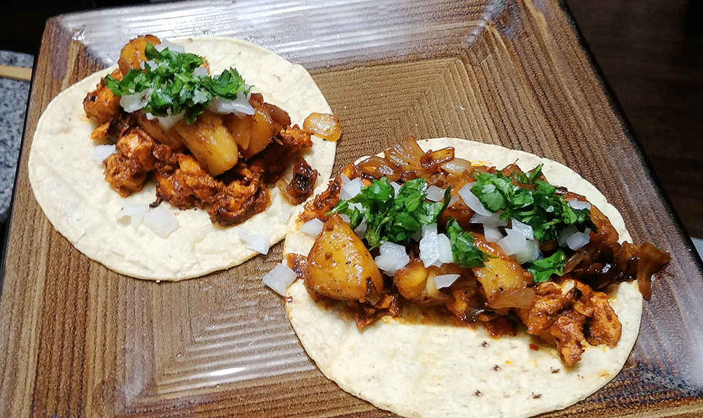 Heat corn tortillas, add “al pastor” salmon and garnishes (onion, cilantro and pineapple), squeeze some fresh lemon juice on top and enjoy!