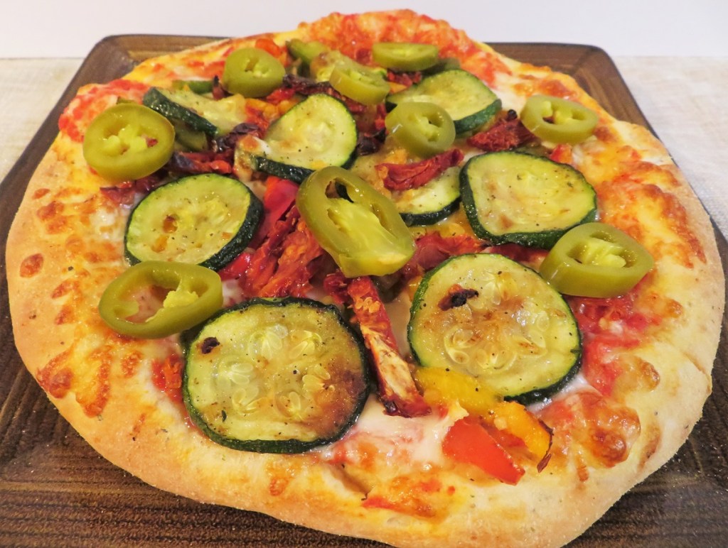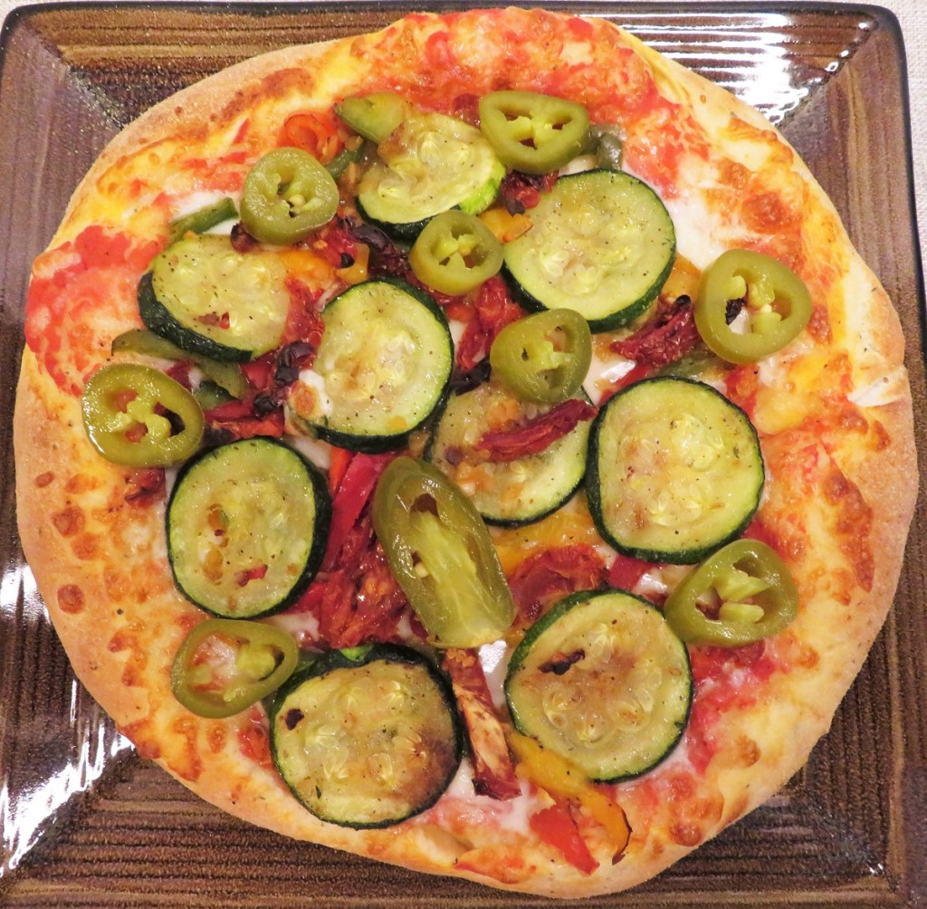 Spray a pizza pan with cooking oil. Put the dough in the tray and add the tomato sauce. Top with caramelized onions, peppers, zucchini slices, sun dry tomatoes and cheese.
