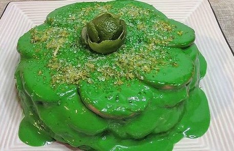 In a bowl mix the evaporated milk, condensed milk, lemon juice, cream cheese and food coloring. Use a hand blender to get an homogeneous mixture.