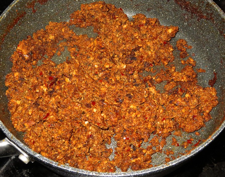- Warm oil in a large deep pan, add tofu crumbs ,and add all spices (cumin, oregano, garlic powder, onion powder, thyme, coriander).