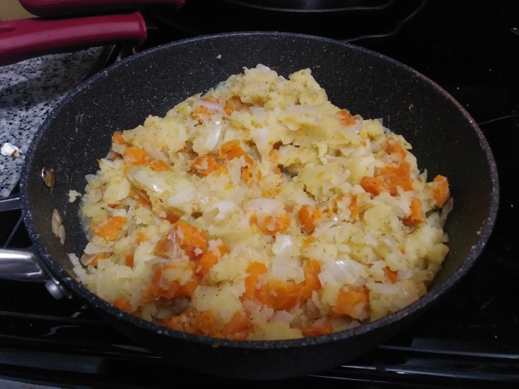 Vegetables: In a large sauce pan add 2 potatoes and 2 carrots cut in cubes, cover with water and boil until vegetables are tender. Reserve. In a large pan at medium heat caramelize onion with 2 tbsps of olive oil, when the onion changes colour add the vegetables and fry for another 5 minutes. Add salt and pepper to your taste.