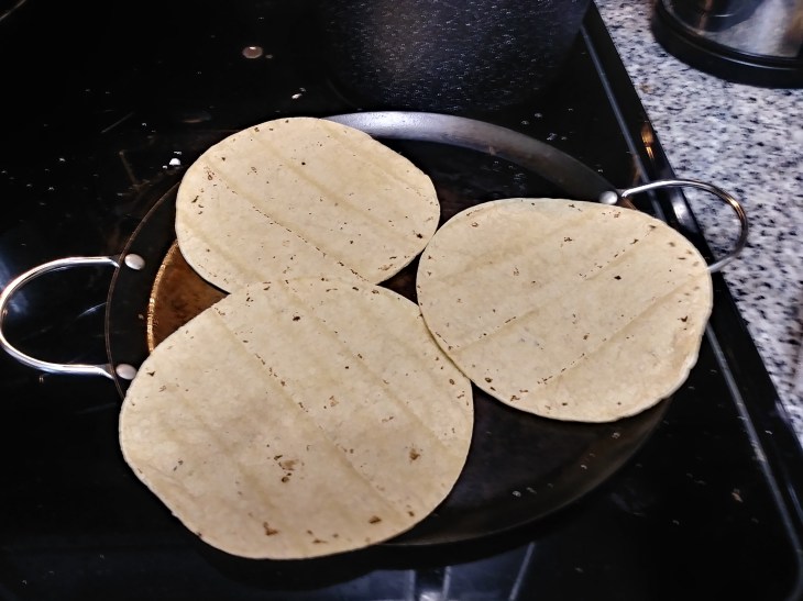 Heat your corn tortillas in the stove using a shallow skillet or comal at medium temperature; alternatively, heat them in the microwave for 40 seconds. Cold tortillas are more difficult to manipulate and break easily plus, charring them a little bit in the comal gives them a smokey flavour.