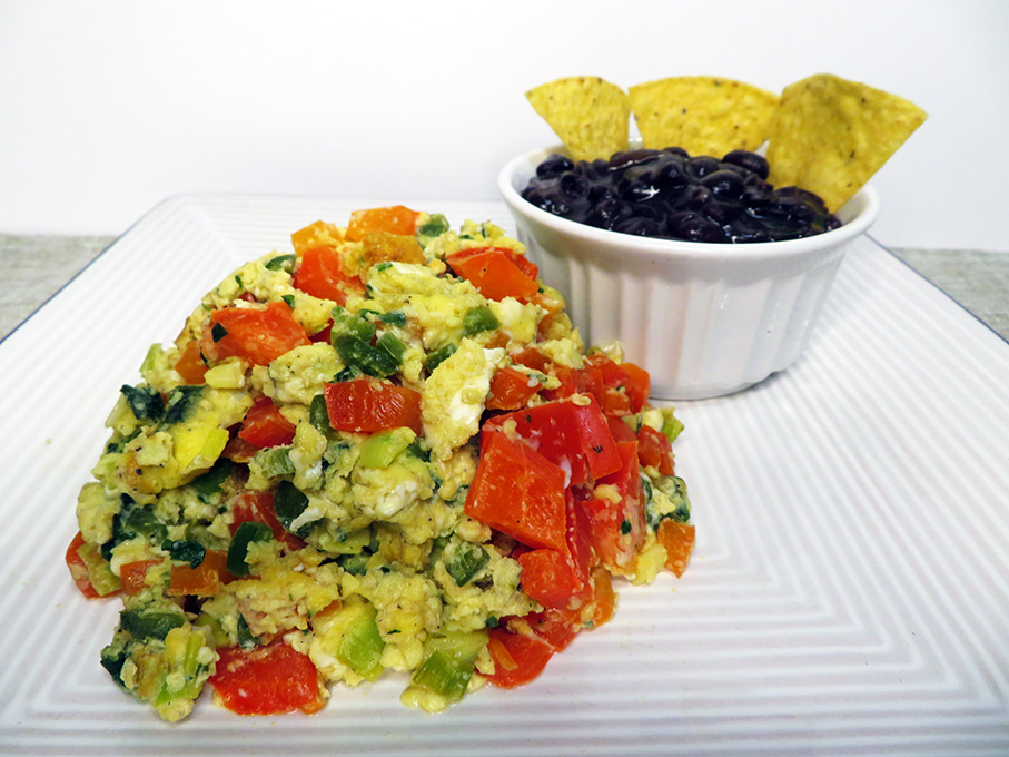 The best way to start your morning is with this mexican-style scrambled eggs with a side of refried beans and nachos.