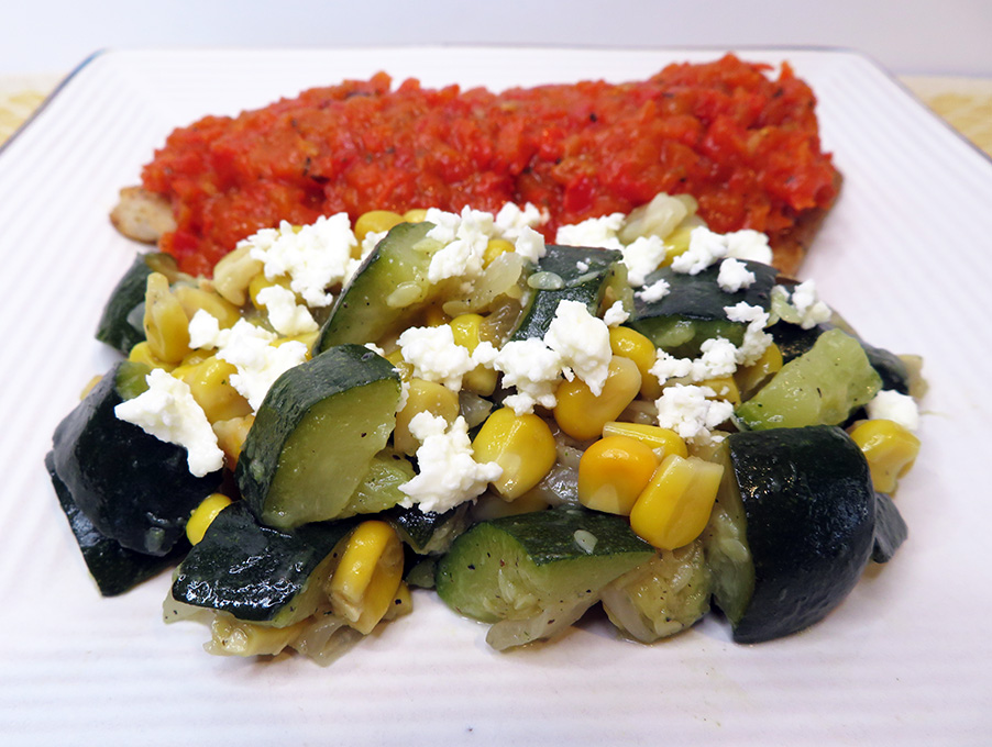 The perfect side dish that goes well with any protein like this fish fillets in red bell peppers and white wine sauce with a side of zucchini and corn plus feta cheese on top.