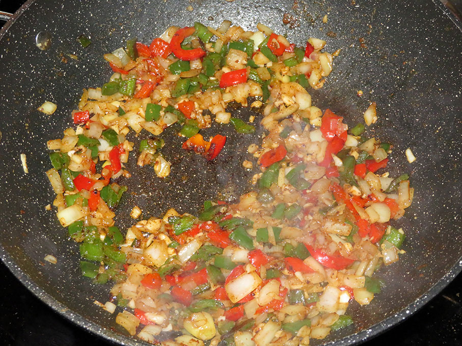 In a large skillet or wok fry the garlic, onion an bell peppers with 4 tbsp. of olive oil.