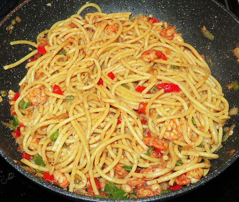 When the pasta is cooked transfer it to the wok with the vegetables; add shrimps then salt and When the pasta is cooked transfer it to the wok with the vegetables. Add shrimps and starch water. Salt and pepper to taste, season with dried chili pepper flakes (optional).