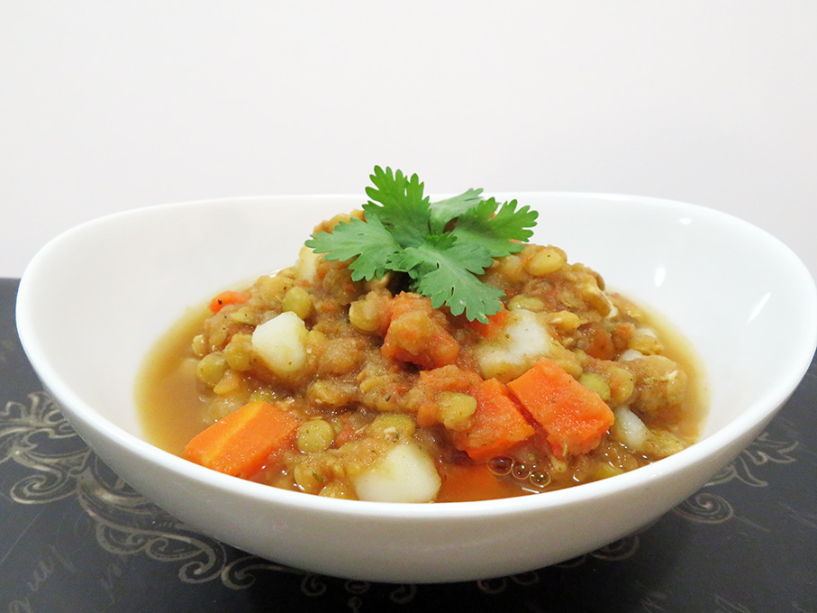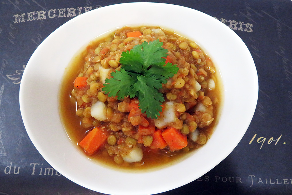 Cook at medium heat for 40 minutes or until the vegetables and lentils are fully cooked and tender. Add the vegetable or chicken broth in powder, salt and pepper to taste.