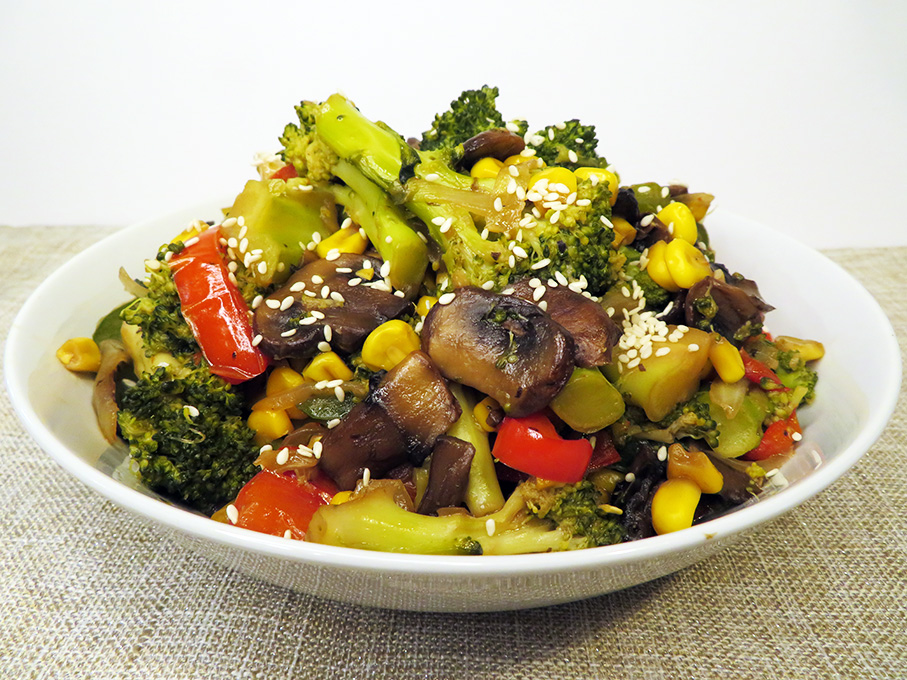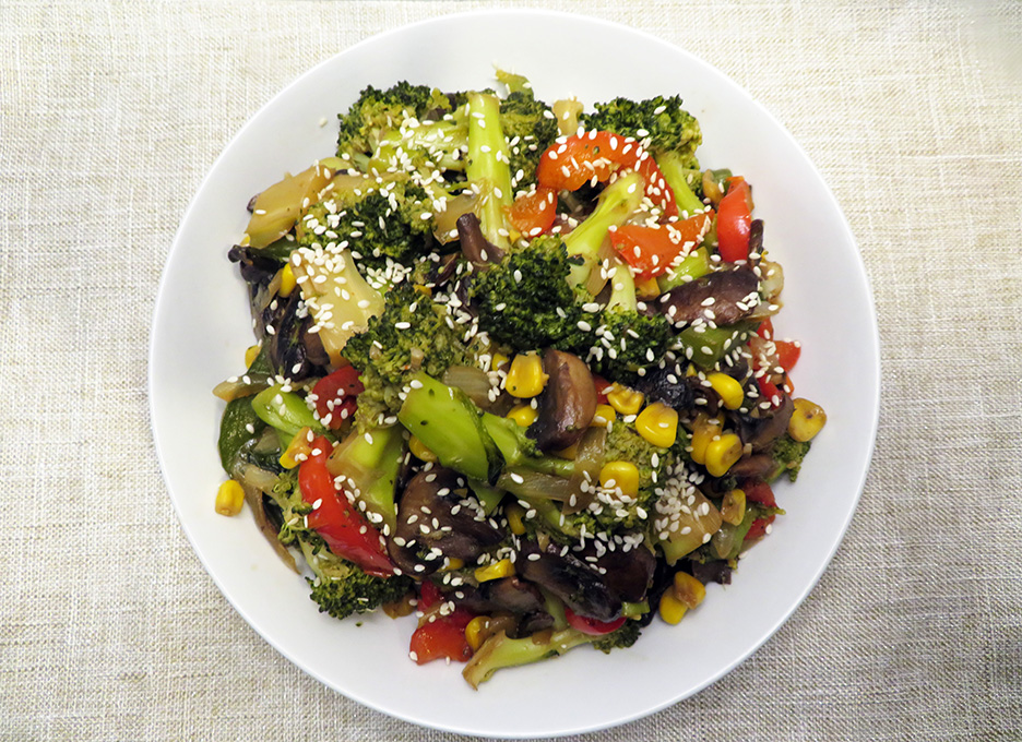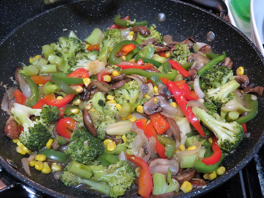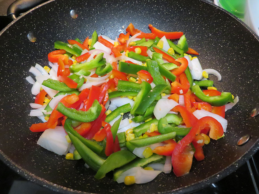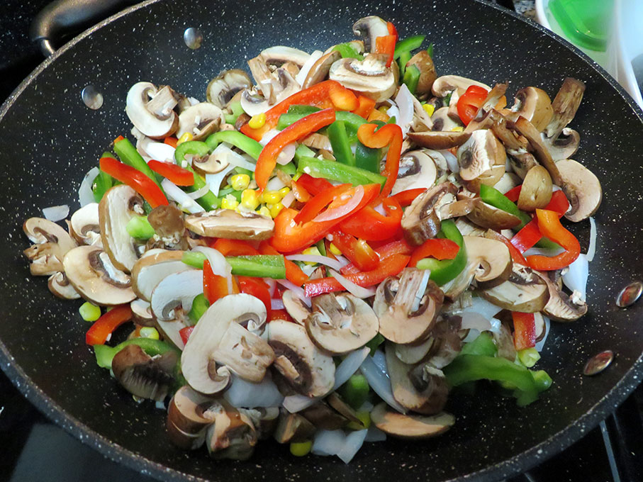 While the broccoli is cooking start frying the onion, peppers, corn kernels and mushrooms with 2 tbsp. of olive oil in a wok at medium heat. Add the broccoli and sauce. Continue frying until juice evaporates.