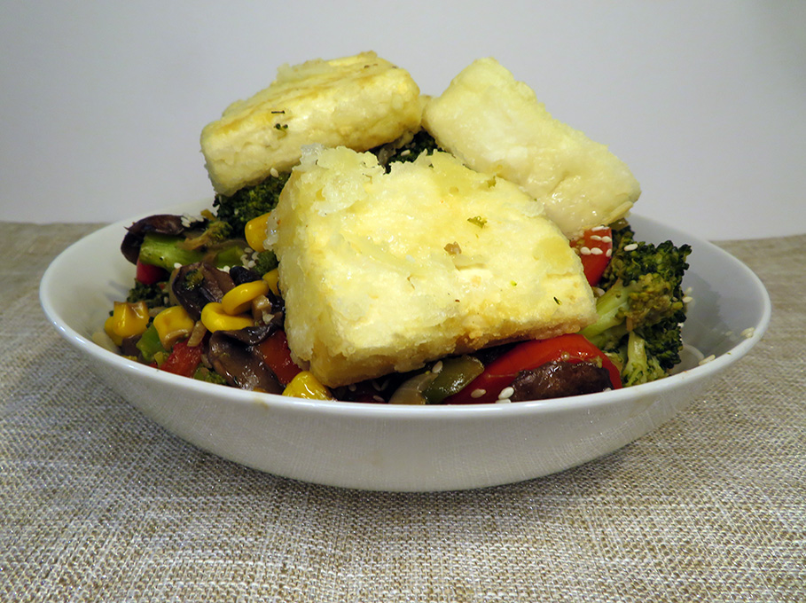 Serve the tofu on top of the vegetables. Garnish with sesame seeds.