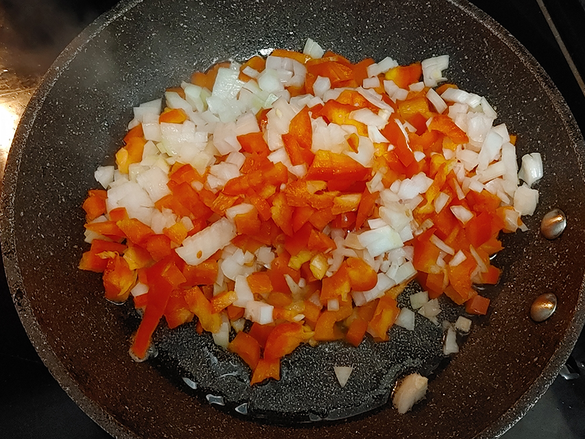 - In a large skillet fry 1 onion, and the red bell pepper with 2 tsp. of olive oil. Fry until the onion is caramelized and the pepper is soft. Season with 1 tbsp. of garlic powder, salt, and pepper.