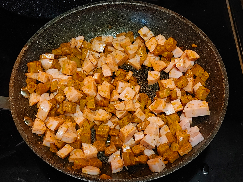 - In a medium-size pan, cook the corn kernels with some olive oil, salt, pepper, paprika, and chili flakes (optional if you want it spicier). Reserve