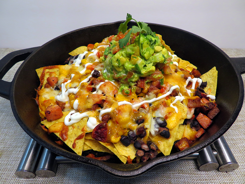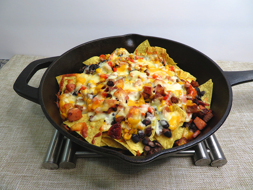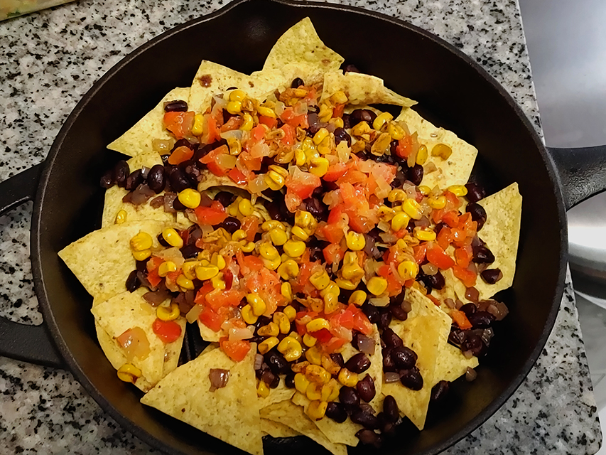 - Assemble the nachos: In a cast-iron skillet or any flat baking, platter adds some spray cooking oil. Arrange the tortilla chips in a single layer, overlapping them slightly but not too much to allow all toppings to be present on every bite.