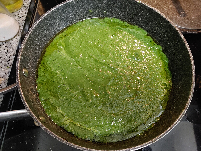 - Add clean spinach leaves to the pan with the onions and garlic and cook until leaves wilt.