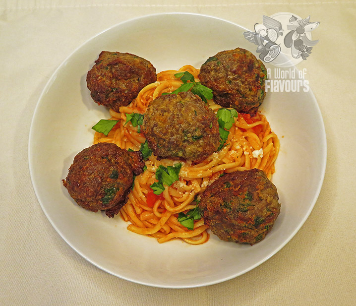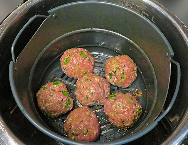 Non-fried option: Place meatballs in the basket of the air fryer leaving some space between meatballs, cook them for 10 minutes at 350 degrees F (175 degrees C), flip them with some tweezers and cook for additional 5 minutes for even browing. Once cooked set aside an reserve.