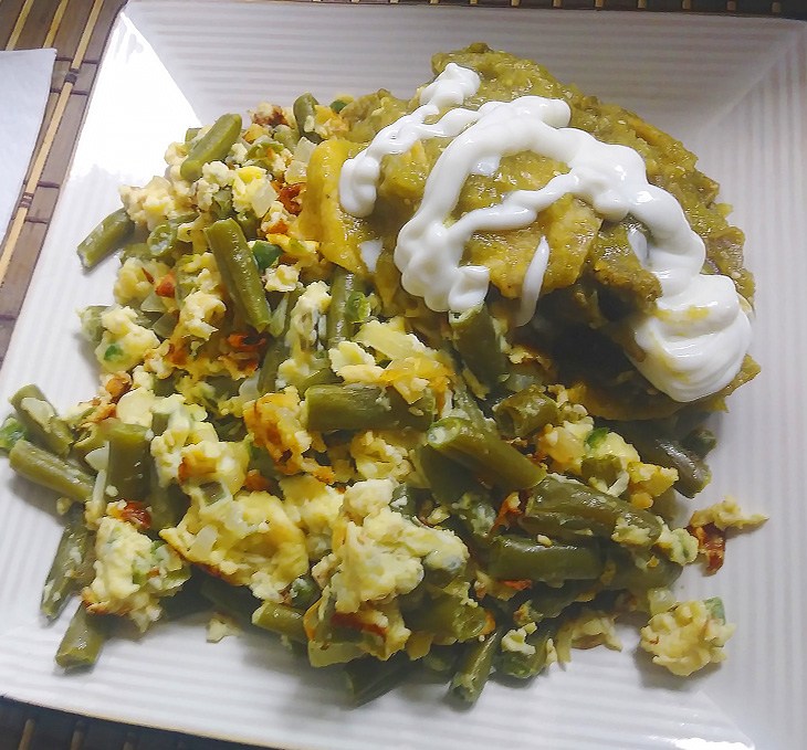 The best way to start your morning is with this mexican-style scrambled eggs with a side of refried beans and nachos.